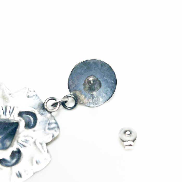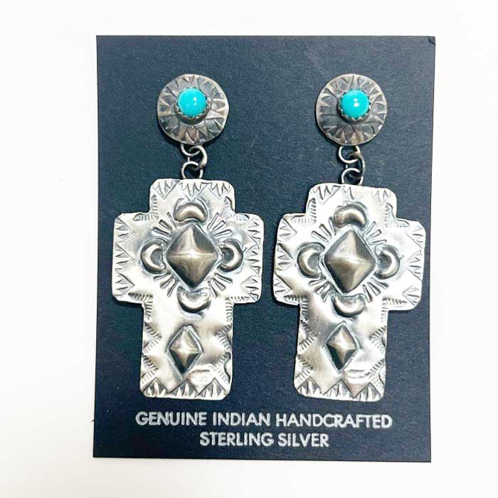 INDIAN JEWELRY NAVAJO "Gabrielle Yazzie" Turquoise Silver Cross Hand Stamped Repousse Dangle Stud Earrings